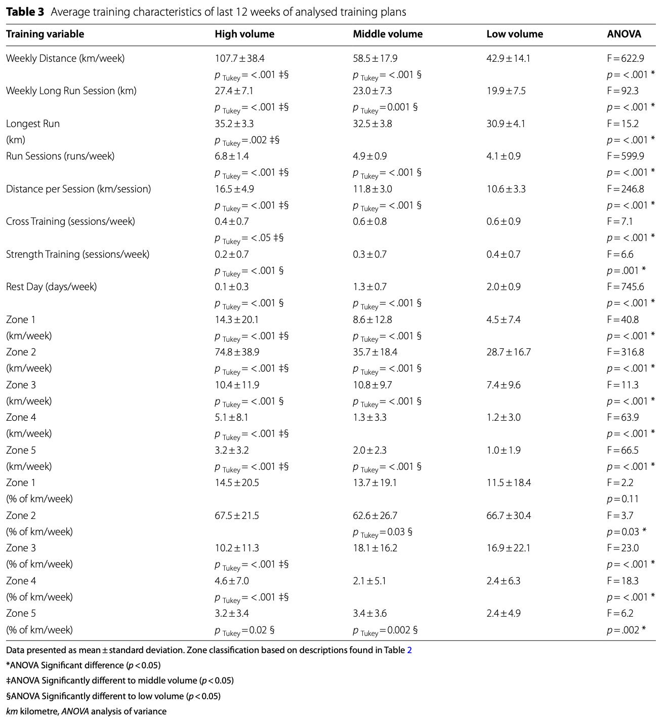 The authors simply wanted to analyse these available plans, and split them into high volume (>90km per week), medium volume (65-90km per week), and low volume (>65km per week) before analysing a few more parameters: