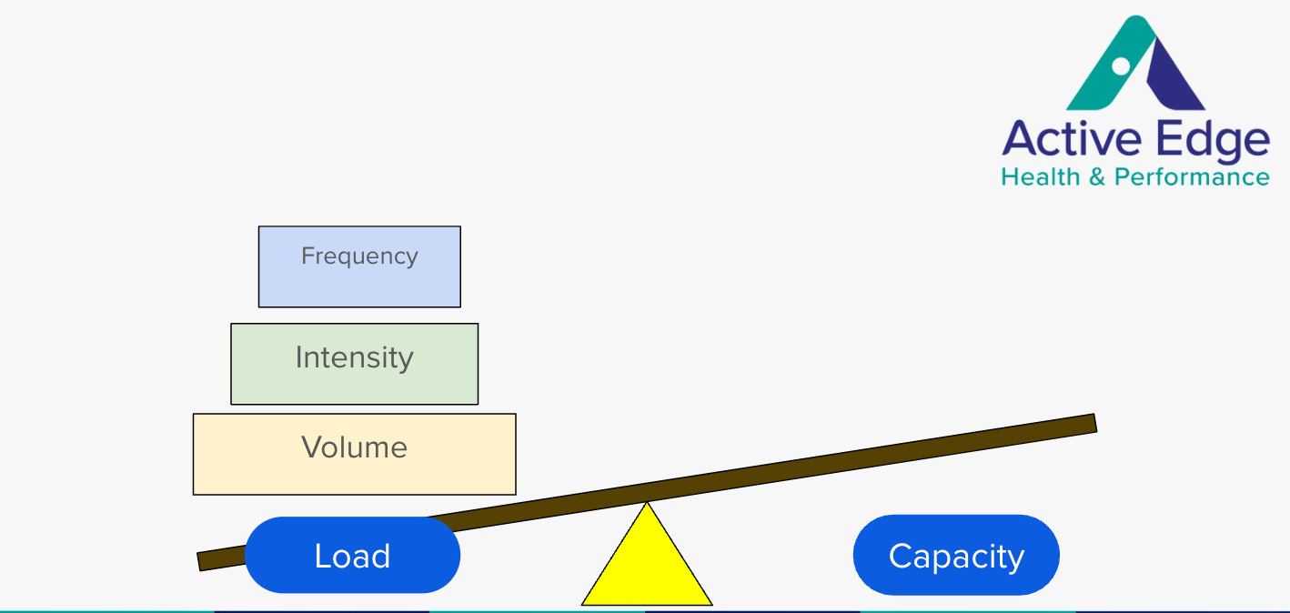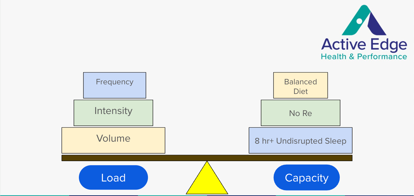 Let’s say we have an individual who runs three times a week, trains at the gym four times a week, and works a full-time job. This is (a very basic guideline) their load. This individual may also sleep eight hours every night, have a balanced diet, and have no recent injuries. This is a basic understanding of a relatively balanced capacity to load.